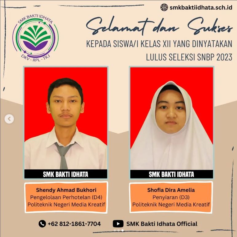 Keluarga besar SMK Bakti Idhata, mengucapkan Selamat dan sukses untuk ananda Shendy Ahmad Bukhori dan Shofia Dira Amelia - Siswa SMK Bakti Idhata yang telah Lulus seleksi masuk Perguruan Tinggi melalui jalur Prestasi SNBP 2023 di Politeknik Negeri Media Kreatif (POLIMEDIA KREATIF). Kami bangga dan teruslah berprestasi..!!!